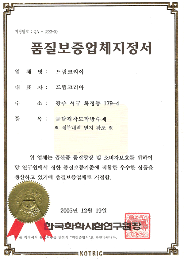 품질보증업체지정서